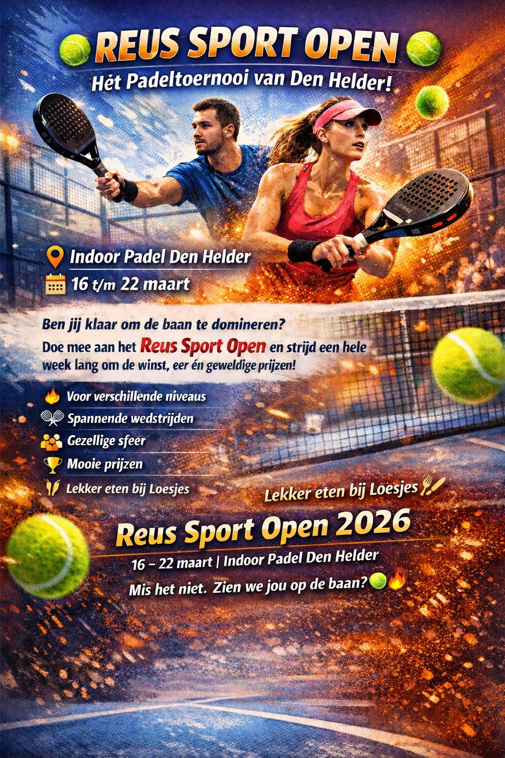Van 16 t/m 22 maart 2026 staat Den Helder volledig in het teken van padel tijdens het Reus Sport Open 2026. Dit spectaculaire toernooi vindt plaats bij Indoor Padel Den Helder en belooft een week vol sport, spanning en gezelligheid te worden voor spelers én toeschouwers.